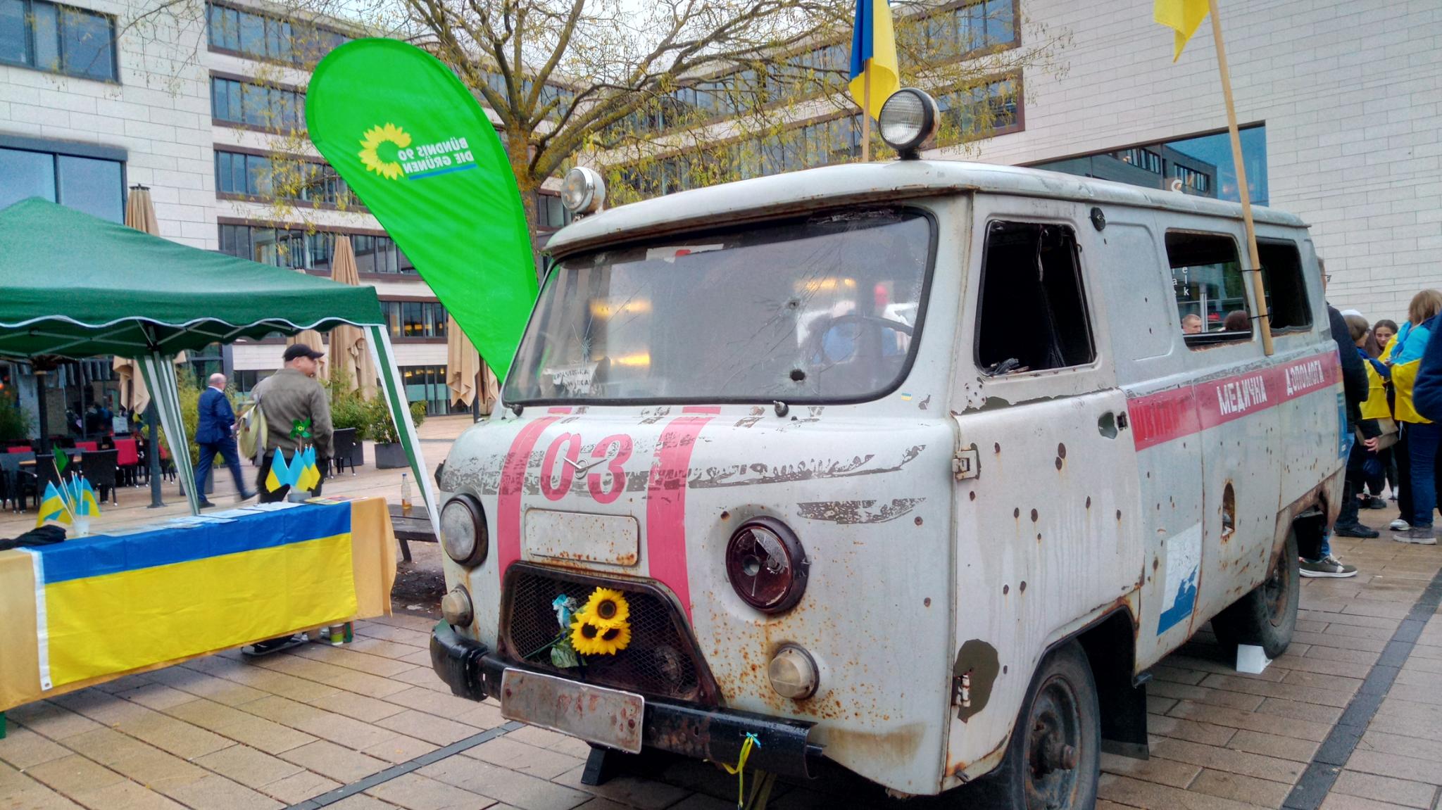 Barwinka ist ein Projekt von Fellas For Europe, das humnitäre Hilfe für die Ukraine anbietet. Ein zerschossener ukrainischer Krankenwagen wird vom 22.-26.10.2025 auf dem Rathausplatz ausgestellt.