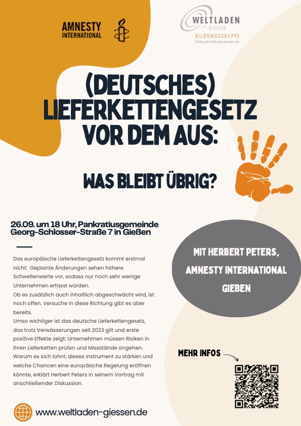 Die Bildungsgruppe des Weltladens zusammen mit Amnesty Intenational Gruppe Gießen laden ein zu einem Vortrag und Gespräch über Einsichten und Aussichten zu diesem Gesetz.