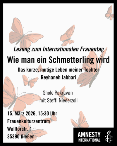 Die Lesung und aktuelle Informationen zum Iran findet statt im Frauenkulturzentrum, Walltorstraße 1 in Gießen.