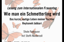 Lesung aus dem Buch „Wie man en Schmetterling Wird“ von Shole Pakravan und Steffi Niederzoll Das Buch erzählt die bewegende Geschichte von Reyhaneh Jabbari, deren Fall weltweit Aufsehen erregte: Mit 19 Jahren wird sie beinahe vergewaltigt, doch sie verteidigt sich und tötet ihren Angreifer. Für diesen Akt der Selbstverteidigung wird sie im Iran zum Tode Weiterlesen